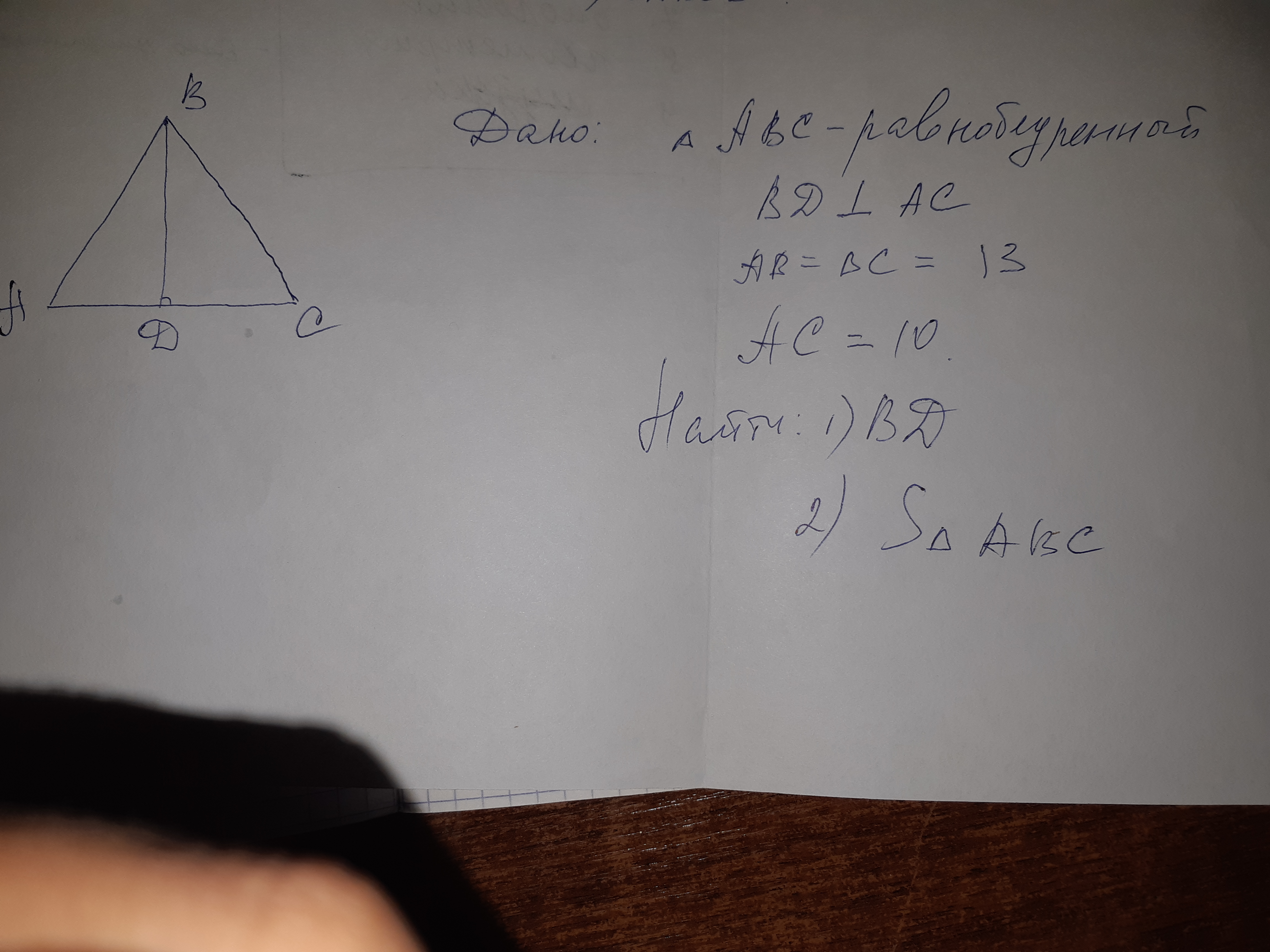 BD в треугольнике является высотой и AC делит пополам . Т.к. треугольник равнобедренный, то AD=AC/2 т.е. 5 см ,BD найдем через т. Пифагора BD^2=AB^2-AD^2= 13^2- 5^2 =√144, BD=12 см